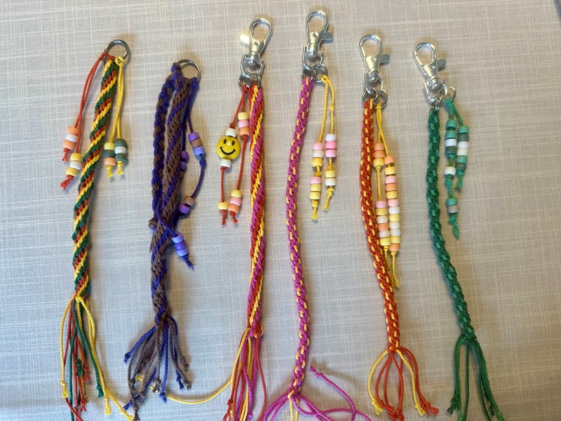 Nora har lavet nøgleringe, som hun sælger for min. 30 kr. stykket. Hvis man vil betale mere, så må man gerne det.