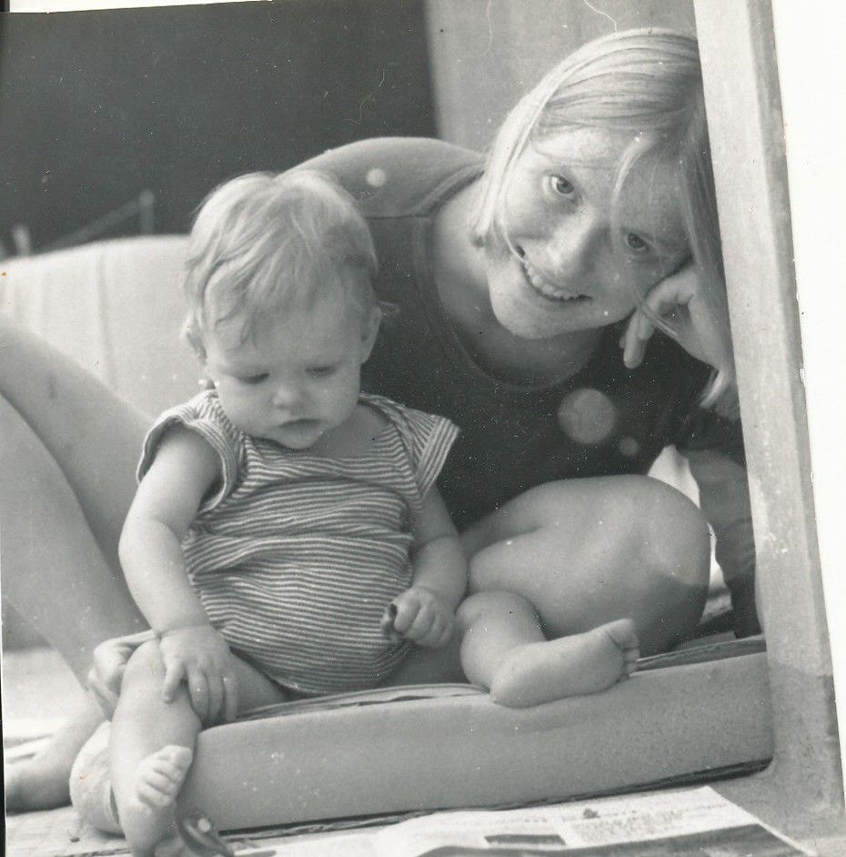 Dette er min mor og mig på altanen i Sprotoften i Nyborg, hvor jeg blev født. Hun er 21 på billedet, og jeg er omkring 8 måneder. Min mor havde det ikke nemt med at blive mor. Kort før min fødsel blev min mormor tvangsindlagt med paranoid skizofreni.